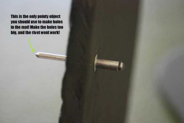 Ahora necesitas hacer un agujero en la estera para el remache. Utilice el extremo afilado del remache para hacer esto. NO MÁS CON CUALQUIER OTRA HERRAMIENTA DE AMPLIAR! Usted no necesitará. El extremo romo del remache también pasará por aquí muy bien. Si la haces demasiado grande, usted necesitará cortar otra suela de su sandalia, y que no va a ser divertido! Qué ello poco instructable te dice que hacer!