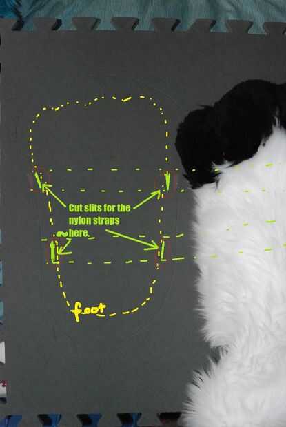 Corte ranuras donde desea colocar las correas de nylon. Debe hacer por lo menos estos dos en la parte superior de su pie, uno detrás de los dedos del pie y de tobillo. También puede Agregar una tira de nylon que va alrededor de la parte posterior de tu tobillo para más ayuda, pero para mi pie, realmente no necesita lo.