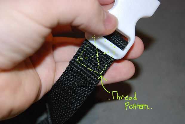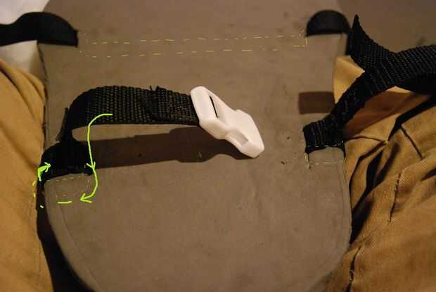 Después de esto, encontrar la mitad de cada uno de sus paracaídas hebillas que no utiliza la fricción para mantener en su lugar (al final clip en la mayoría de los casos; que no ajuste) y coserlas a las correas mediante el hilo y la aguja. Hice un cuadrado con una X en la plaza para mantener estos en (ilustrado), esto es lo mismo que usted puede utilizar para conectar las correas individuales así.