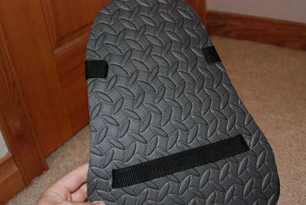 Una vez que las tiras de nylon cortadas, cuerdas a través de un agujero, debajo de la parte principal de la almohadilla y luego el otro orificio. Desde el lado "superior" (el lado de su pie será el), no debería ver cualquier correa entre dos ranuras, y las correas deben venir para arriba y fuera de ellos.