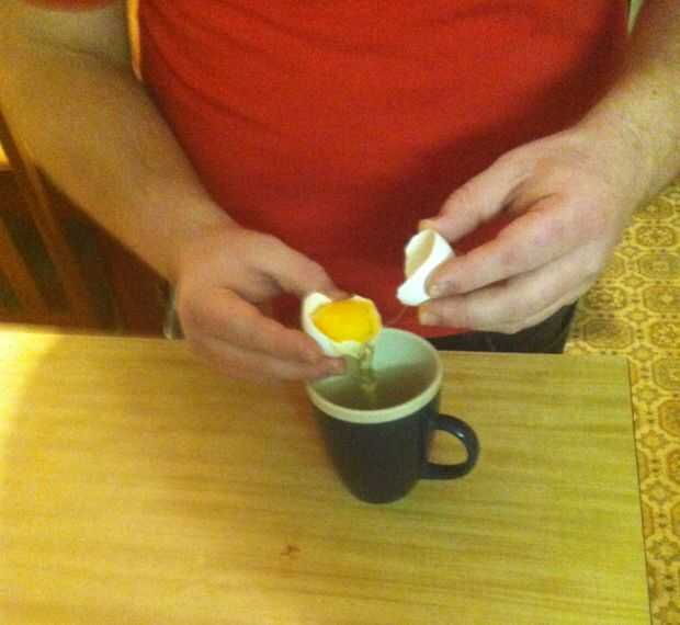 Primero separar un huevo. Para ello, romper el huevo en el centro del huevo. A continuación, vierta el huevo de una mitad a la otra hasta que quede solamente el yugo. Puede desechar la clara del huevo o guardarla para una tortilla. Poner yugo en un tazón pequeño o taza. A continuación, agregue una cucharada de agua para el yugo. Batir la mezcla de agua yugo con un tenedor hasta que completamente se mezcla juntos. Ponga a un lado.