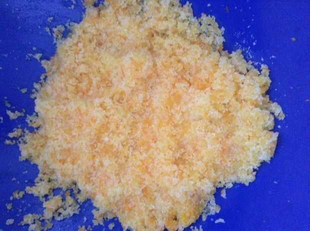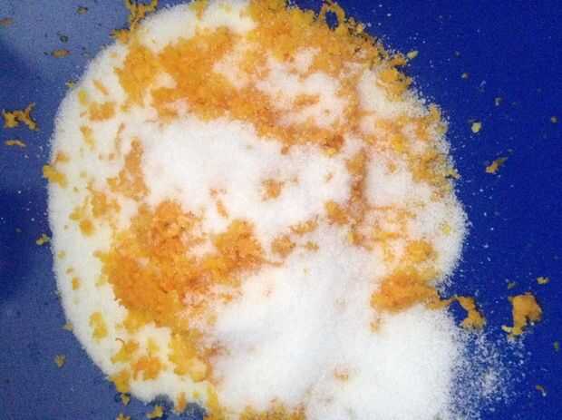 En un tazón mediano/grande mezcla 1/3 taza de azúcar y usar al zester Pele la naranja y mezclar hasta que puede oler la naranja el azúcar y el azúcar húmedo