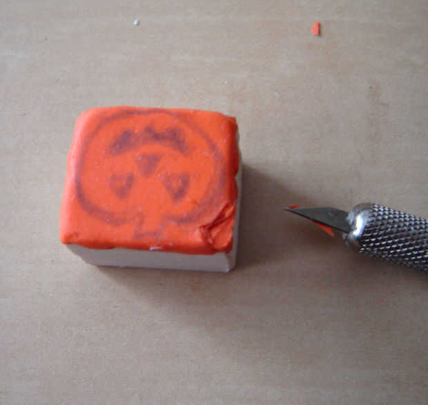 Talla el sello después de que ha curado es similar a hacer un sello de goma de borrar.  Preparar su sello como en paso 2 y dejar curar durante 24 horas.  Con un lápiz dibujar la imagen sobre el sello.  Si desea tener texto en el sello debe ser una imagen del espejo.  Tallar la forma con una navaja.  Tómese su tiempo y trabajar con cuidado, a diferencia de los sellos en el paso 3 que no puede suavizar tus errores. Probar el sello como vas a ver que áreas necesitan más talla.
