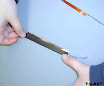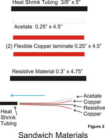 El material resistente se intercala entre los dos laminados revestidos de cobre. Los lados de cobre de los laminados se enfrentan hacia el material resistente; Vea las figuras 3, 4 y 5. Si usted suelda los cables en el mismo lado de los laminados, al montar el sensor, los cables se situarán en las esquinas opuestas, permitiendo que la base del sensor para poner más planas.