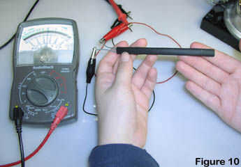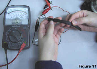 Ponga un medidor VOM leer ohmios. El sensor que se construyó tenía una resistencia nominal de aproximadamente 20K ohmios, vea la figura 10. Como el sensor se dobla en una dirección figura 12 resistencia disminuye en proporción a la curva a unos 2 k, véase la figura 11. El sensor de flexión en la dirección opuesta disminuye también la resistencia proporcional a la curva a 2 K ohmios, vea la figura 12.