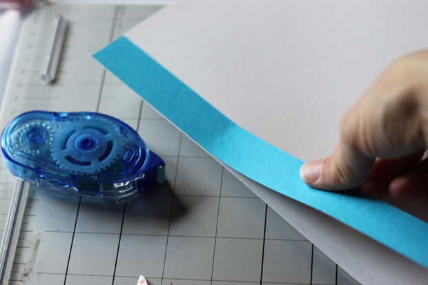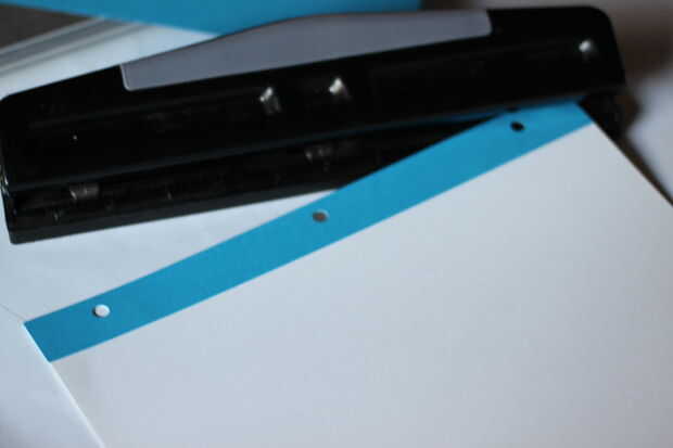 Con adhesivo de doble cara (mi preferencia es marca Mono rodillo adhesivo), pegar la tira a lo largo de la parte que será perforada de los agujeros de la carpeta.