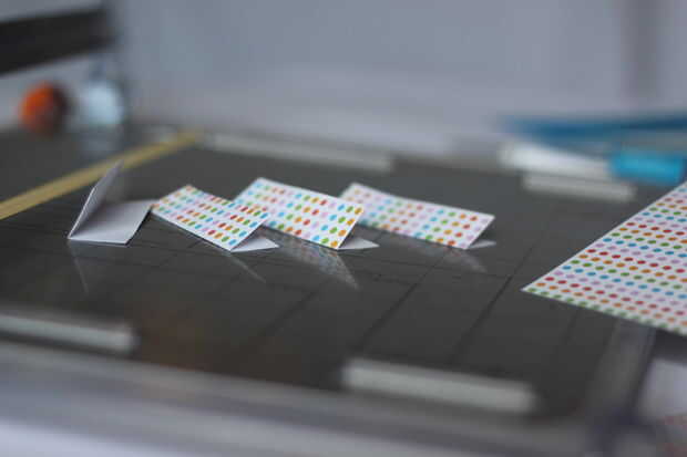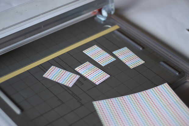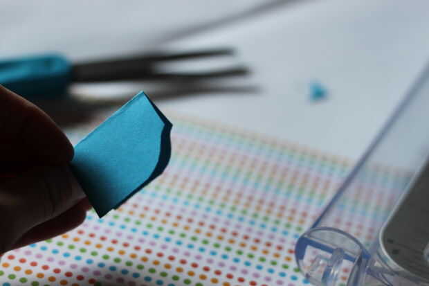 Cortar la forma deseada de su ficha en la plantilla y desdoblar para asegurarse de que encaja en el borde doblado de las pestañas decorativas.