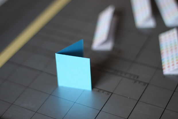 Dobla cada rectángulo a lo largo por la mitad con la impresión decorativa en el exterior.