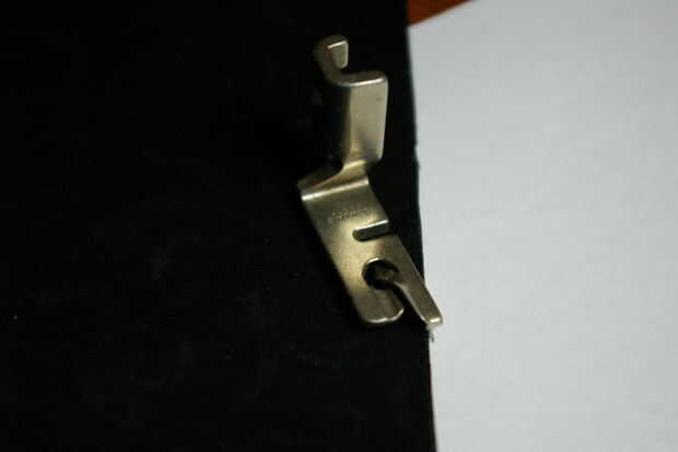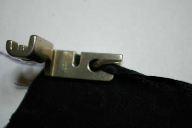 Puede lograr un acabado más profesional con el pie prensatela de dobladillo estrecho y una máquina de coser normal. El prensatelas tiene un brazo espiral que guía el borde de la tela debajo y mantenga en su lugar mientras la máquina cose sobre él. Para utilizar este acabado, coloque el lado derecho de la tela hacia abajo, levante el borde y colóquelo en las espirales del prensatelas. La primera imagen muestra el pie. La cuarta imagen muestra un buen comienzo y forma rollos de la tela.