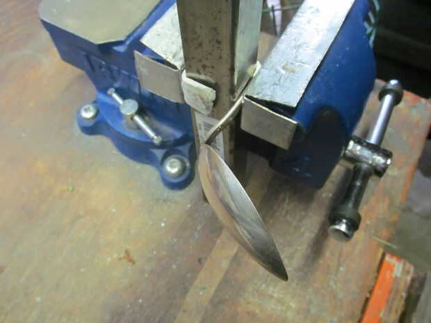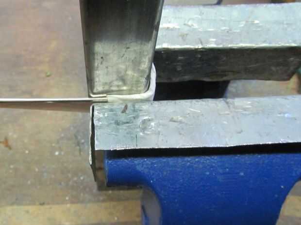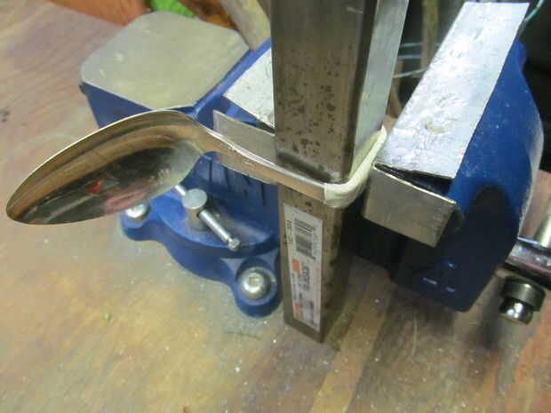 -Sujete la cuchara contra el tubo otra vez, de modo que sobresale la parte desplegada de la manija desde el lado de la mordaza.