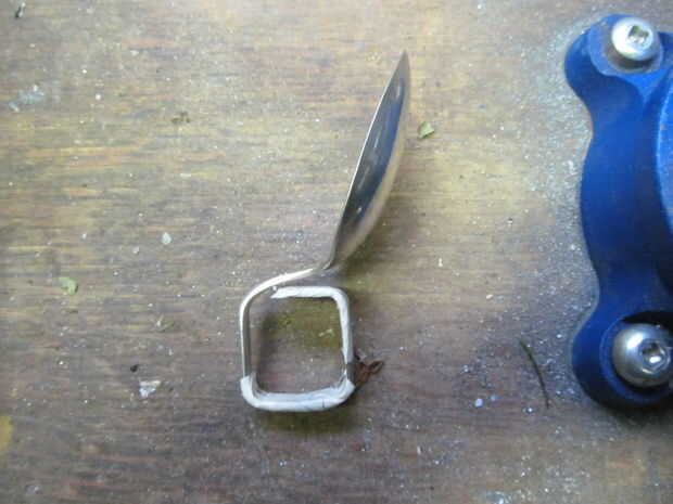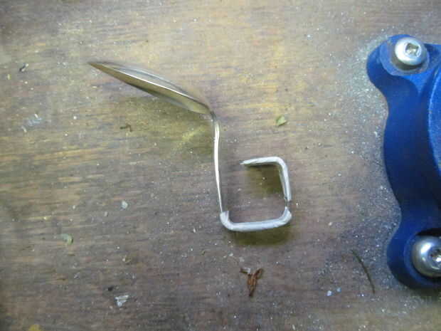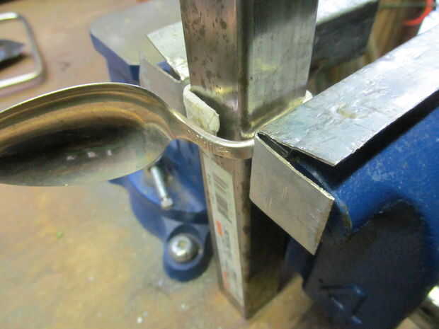 -Para la cuarta y última curva, coloque la cuchara como se muestra en la imagen 4 y fíjela firmemente. Doblar el resto de la cuchara alrededor del tubo hasta que cumple con el extremo de la manija. El mango debe formar un cuadrado con un lado superpuesto.