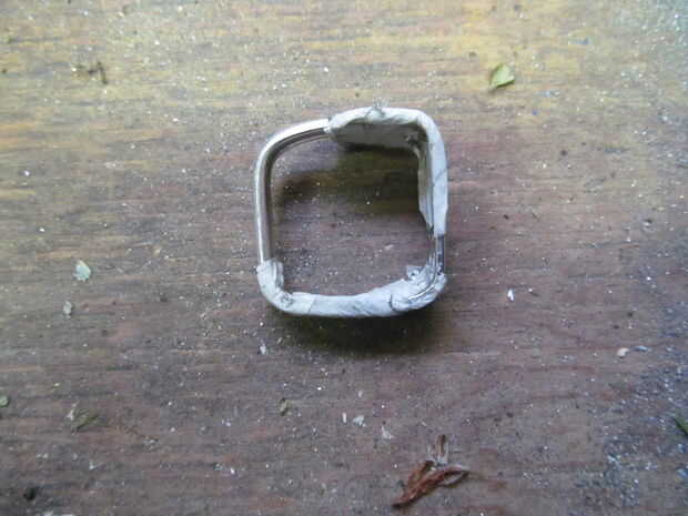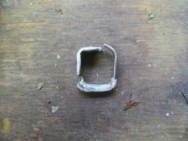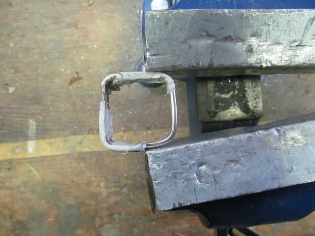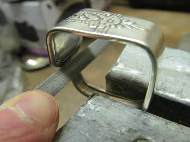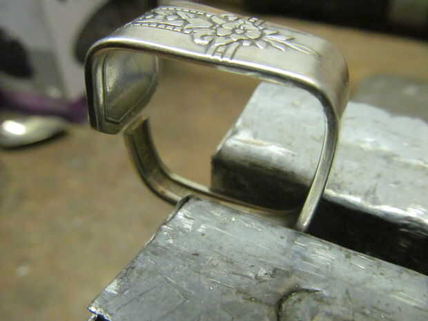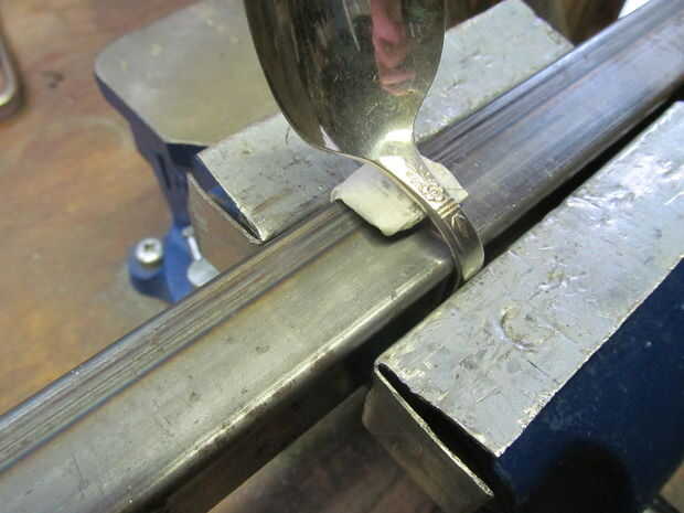 -Introducir la cuchara en el tubo cuadrado y fijarlo con la abrazadera en el tornillo de banco. Utilizar la Sierra de marquetería para cortar el extremo de "bowl" de donde se encuentra con la parte inferior de la empuñadura. El extremo donde hiciste el corte será levantado, dejando la plaza abierta.