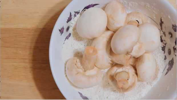 Añadir los champiñones en el recipiente de la mezcla de harina.