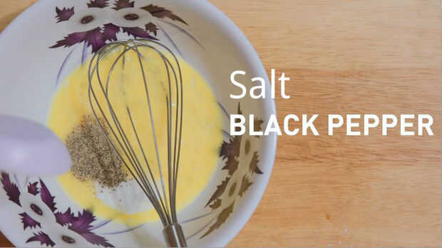 En un bol, batir un huevo, la mitad de una cuchara de sal y una media cuchara de pimienta negra.
