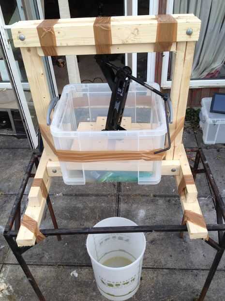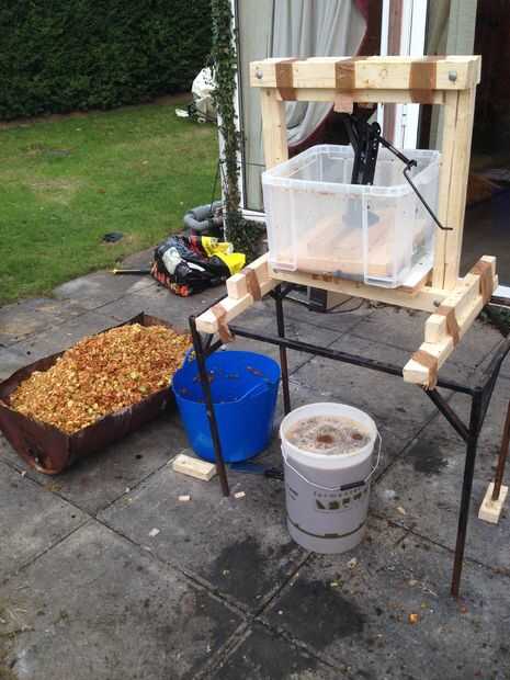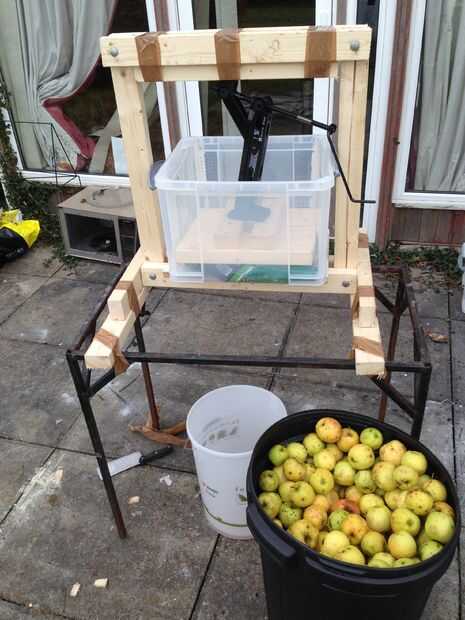 La prensa consta de un marco de madera sólido que se hace de temporizador y atornillado. Se crea una paleta de madera que tiene un fondo plano y se utiliza para presionar en la fruta. Un gato del coche se utiliza para presionar la paleta de madera en la fruta aplicando fuerza entre la parte superior del marco y la paleta. El envase de almacenaje mantiene la manzana y canales cuidadosamente el zumo de manzana a su contenedor.