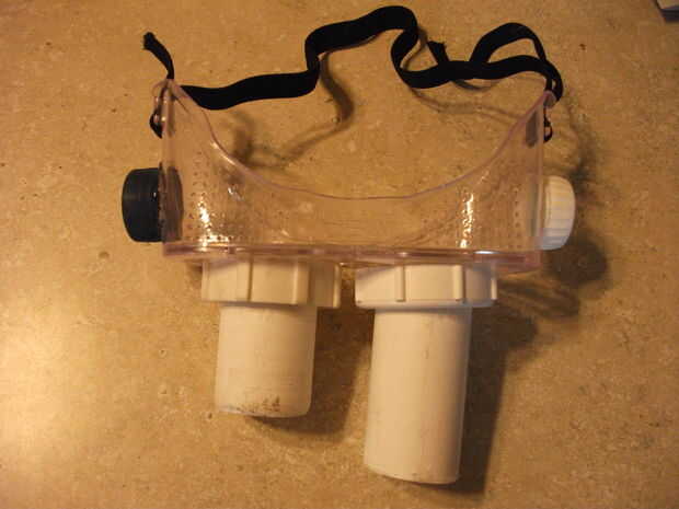 Enchufe en su pegamento pistola y deje que se siente. Recuerde colocar en una superficie no resistente al calor. Yo uso un pedazo pesado de papel de estaño que doblé varias veces para asegurarse de que no calienta la parte inferior y mantenga siempre lejos de plásticos, mascotas y niños pequeños. Si usted está haciendo este proyecto con los niños estas pocas piezas siguiente tienen un adulto Ayude a cabo. Pieza de pegamento caliente del PVC de 3 pulgadas de tubo en el lado izquierdo de las gafas y el 1 1/2 pulgada a la derecha. Ahora tome los soportes de tubería de PVC y pegamento a la base de los dos tubos, uno a cada lado. Si lo desea, aquí es donde puede pegar los tapones de botellas para hacer perillas de ajuste. Esto es todo para ti, tanto en los lados, uno en la parte superior y otro en la parte inferior no importa donde estén, siempre y cuando usted está feliz de cómo se ve. En la foto los tengo a los lados.
