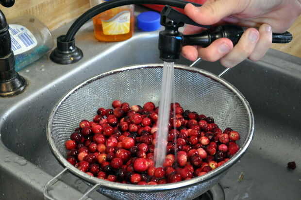 Antes de que podamos llegar a captar la esencia de arándanos debemos lavar los arándanos y naranjas.  Así que lave las naranjas y los arándanos de la descarga en el colador para darles una buena manguera.