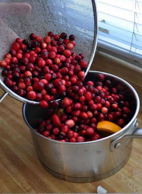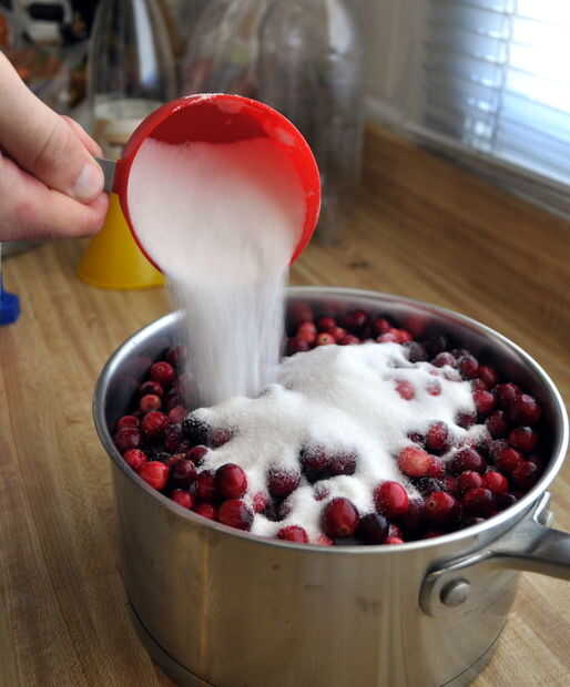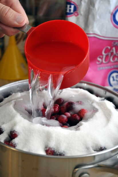 Ahora que tienes una hermosa olla de gajos de naranja sin duda perfectos es hora de agregar el resto de los ingredientes.  Agarra tu colador lleno de bayas y volcarlos en.  A continuación Agregue las 4 tazas (800g) de azúcar. (Se ve como nieve fresca).  Finalmente agregue el agua.  Ahora vamos a la cabeza a la estufa.