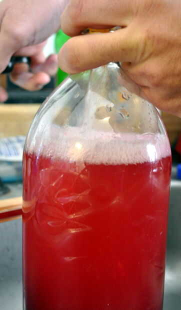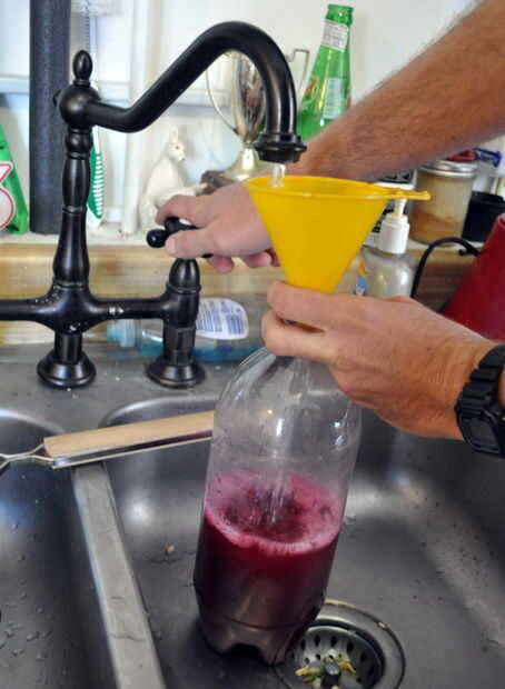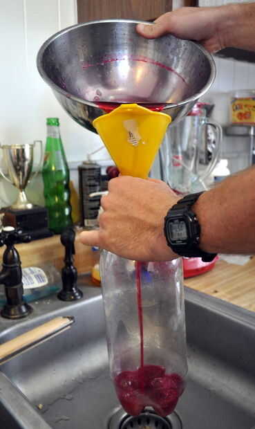 Después de un refrescante mi auto con una siesta volví a manchado goo arándano y un bol lleno de almíbar sabroso.  Usando el vertido de embudo el jarabe dentro de la botella de dos litro vacíos.  Luego añadir agua a la botella de refresco hasta que el nivel de líquido sobre la curva de la parte superior de la botella.  Incluí una foto solo para que veáis lo que quiero decir.  A continuación coloque su botella de refresco en el nevera/congelador dependiendo de cuánto tiempo desea el enfriamiento paso a tomar.  Elegí el congelador.