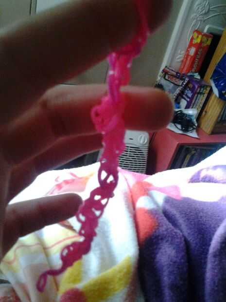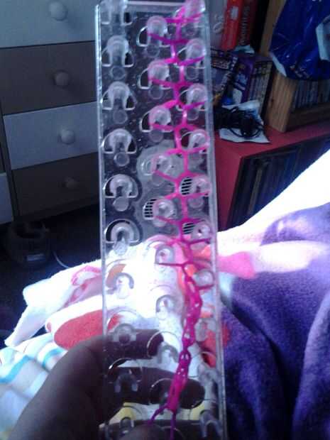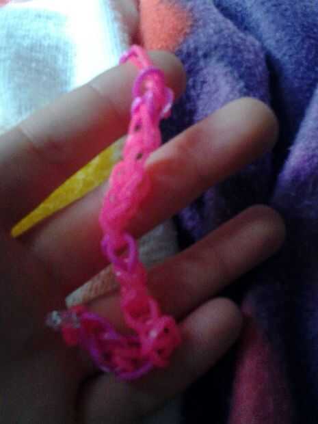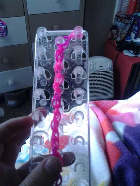 Cuando usted toma los braclets del telar, tienes que tener cuidado no bandas salen. Quite el braclet de la parte inferior hasta la parte superior. Poner el clip de s o c en la parte superior el braclet cuando todo apagado. Doblar el extremo así como las otras bandas, entonces él puso otro extremo de la pinza tan su hecho.