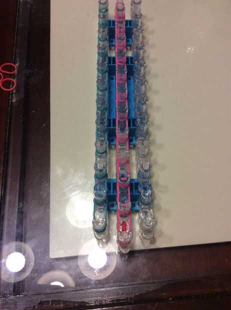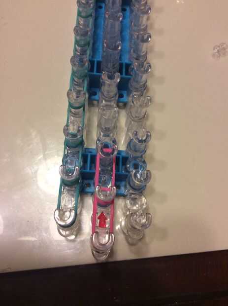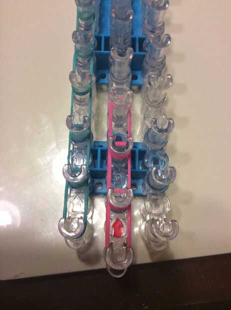 Tomar su próximo conjunto de bandas de color y empezar a colocarlos en la columna media de clavijas. Coloque el ir hacia adelante hasta el final.