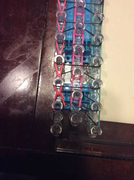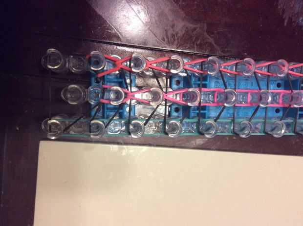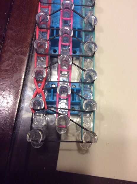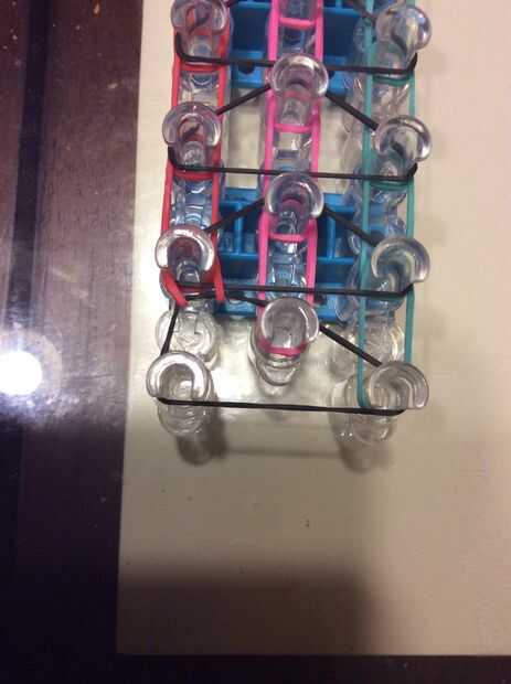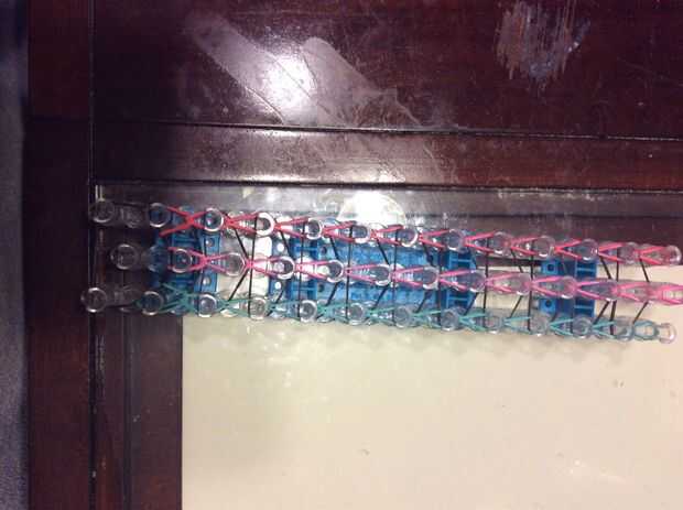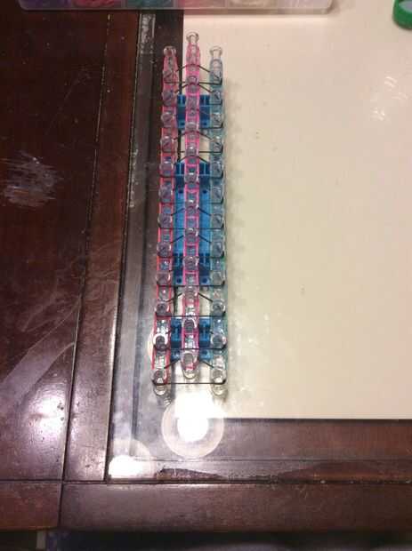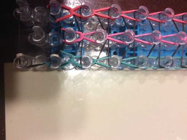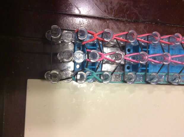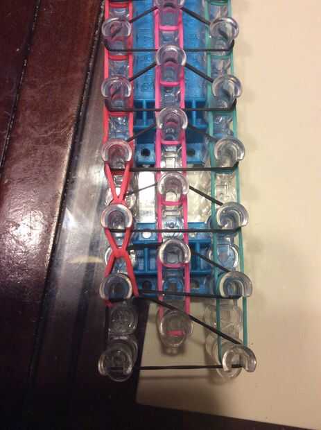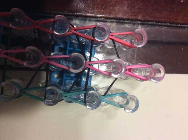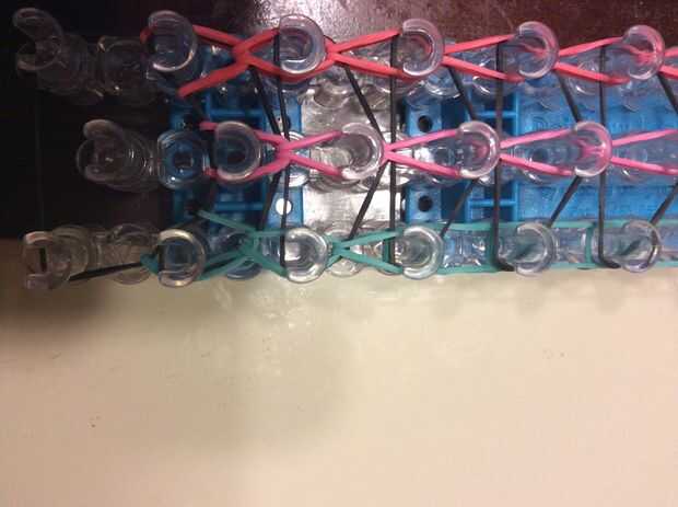 Esta es la pulsera como se verá cuando esté terminado. Yo recomiendo usar 3 colores diferentes para esta pulsera. Antes de poner las bandas en el paso siguiente Asegúrese de que doble todas las bandas, si crees que me refiero a hacer una banda de la