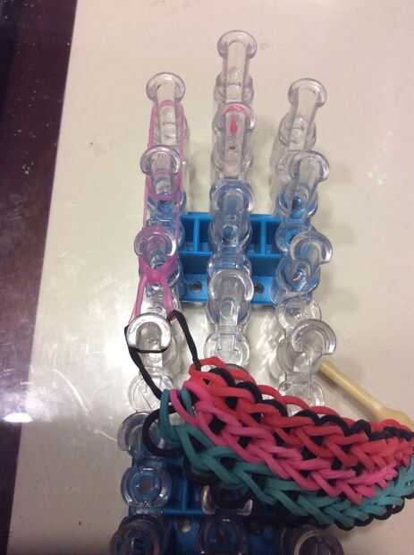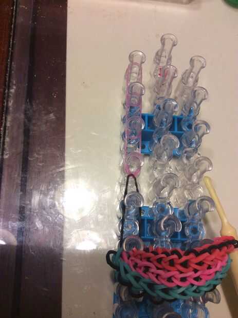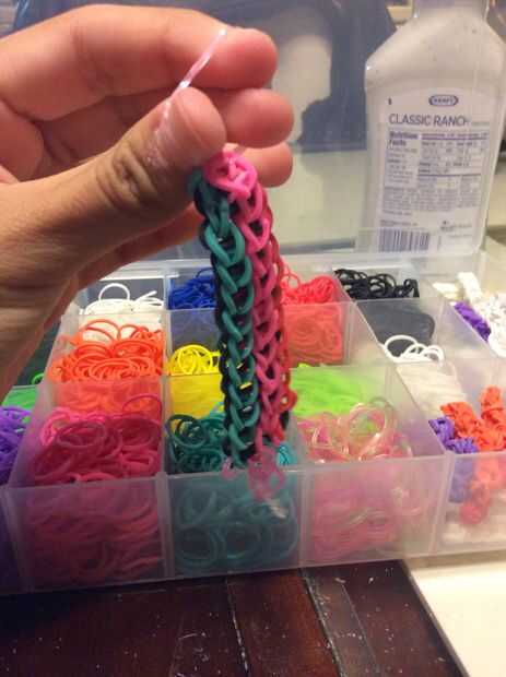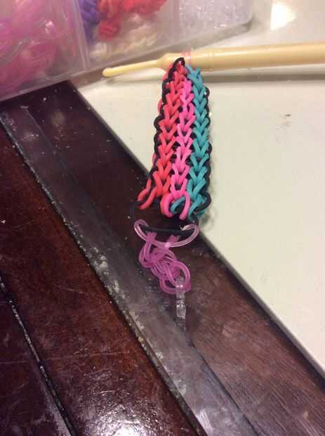 Esta es la pulsera como se verá cuando esté terminado. Yo recomiendo usar 3 colores diferentes para esta pulsera. Antes de poner las bandas en el paso siguiente Asegúrese de que doble todas las bandas, si crees que me refiero a hacer una banda de la