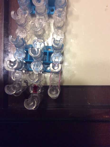 cómo hacer esta pulsera con bandas de goma.Paso 1: Cosas necesarias 1.any loom2,2 colores de su eleccióngancho de 3.aclips de s o c 4,2Paso 2: Configurar Colocar una banda de retorcidos en el extremo del telar, saltar un espacio luego pones uno del m