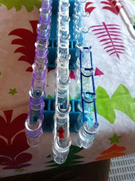 cosas que usted necesita:s-clipganchotelarbandas de gomaPaso 1: a partir Puso sus bandas en una posición de zig zag como en el cuadro hasta llegar al final. Utilicé color de rosa ya que tengo muchos.Paso 2: engancha El telar alrededor del tirón por l