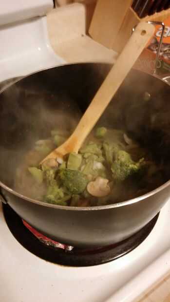 una vez la cebolla había cocinado un poco (yo estaba revolviendo de vez en cuando, pero el agua generalmente ayuda a evitar que se queme y lo tenía en med - añadido de alta. las verduras congeladas y agitación continua