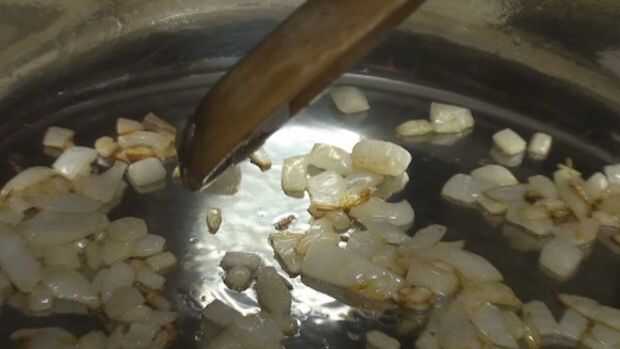 Ajuste estufa a medio alto y comience a calentar la olla... Añadir 1 cucharada de aceite y espere a que se caliente. Puede comprobar si el aceite está listo, agregando un trozo de cebolla. Si chisporrotea la cebolla, el aceite está listo. Añadir la cebolla picada en aceite. Revuelva la puesta para evitar que se queme. Cocine hasta que la cebolla se vuelven translúcida y empezar a doren.