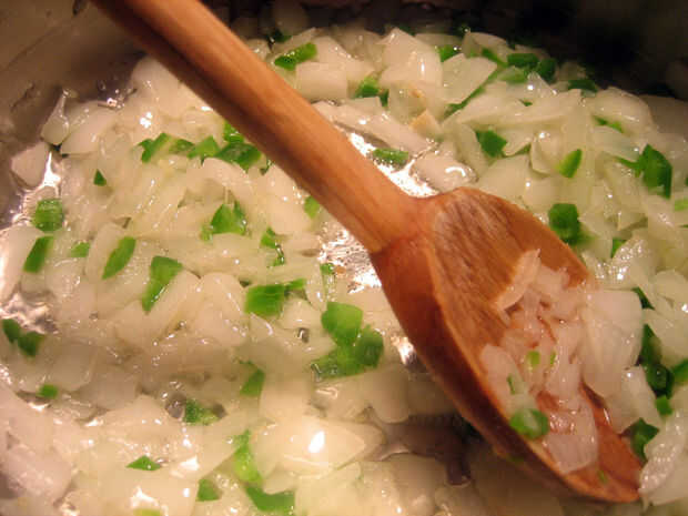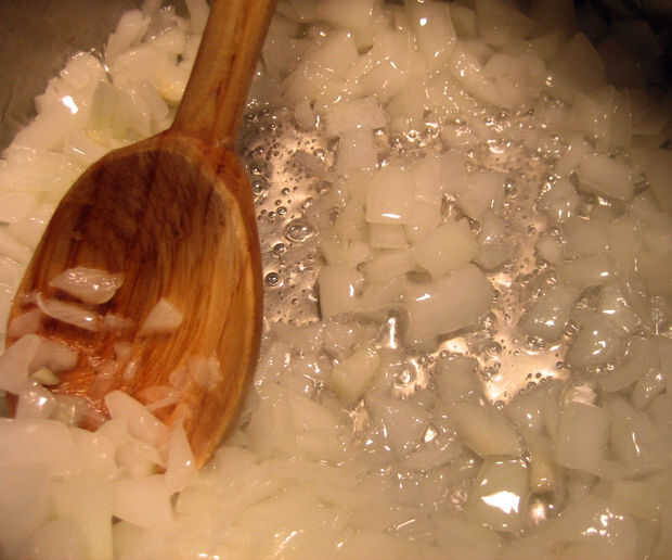 Añadir un par de cucharadas de aceite de canola con vegetales a la sartén y en fuego medio. Añadir las cebollas y cocinar por unos minutos, hasta que comiencen a ablandar y vuelta translúcido.