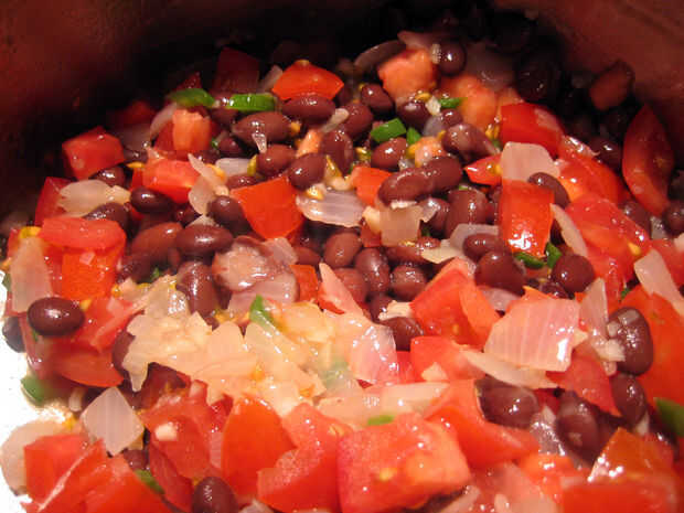 Luego, tiro en los jalapeños cocinar para un minuto o tan y luego chuck en el ajo. Revuelve esto alrededor hasta que realmente empieza a olerlo y luego volcar en los tomates y su jugo y las alubias.