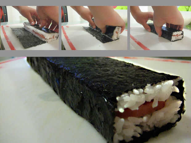 Deje que el musubi posición plana por unos cinco minutos para que los extremos sueltos del nori puede unirse (por el calor y la humedad del arroz) y mantener el arroz y spam firmemente juntos.