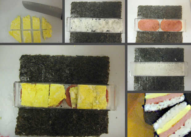 4. Agregue el spam, luego agregue pedazos de huevo sobre spam