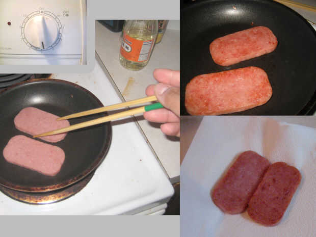 te muestro cómo hacer Spam Musubi y también la técnica que se enseñaba me sobre cómo hacer un Onigiri / RiceballIngredientes:Spam * corte en tirasHojas de Nori (alga marina) * cortar largo suficientes tiras para envolverHojas huevo:1 huevo batido1 ce