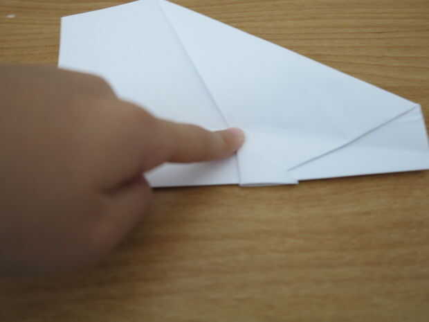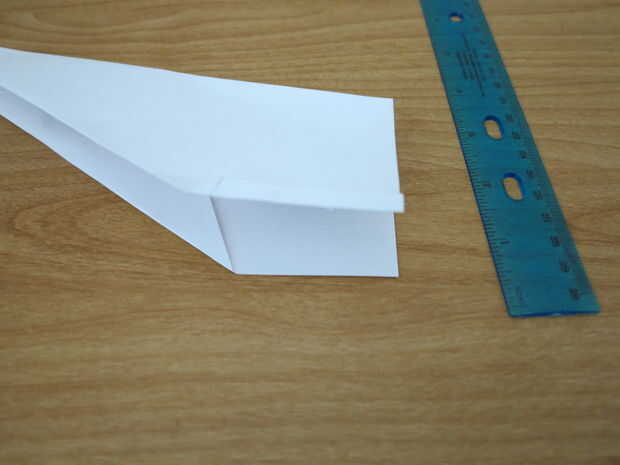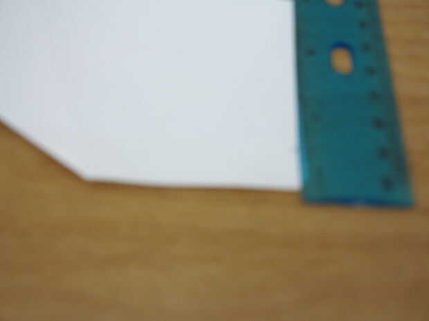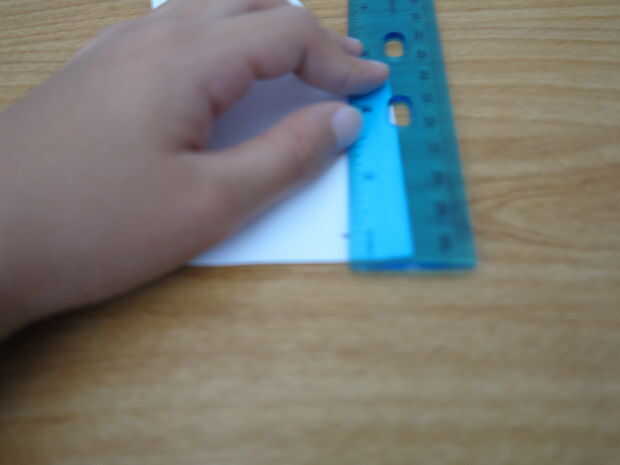 Ahora dobla el papel por la mitad y doblar las aletas hacia abajo hasta la esquina del triángulo. Luego tome una de las aletas y la regla y pluma o lápiz. Marca es una media pulgada y doblar a la marca. Lo mismo al otro lado. Luego gire su apuntando lejos de usted y tomar su tijeras, lápiz y regla y marca la parte posterior de la cuarta línea en centímetro y asegúrese de que tiene otra a y lo mismo y darle la vuelta una y otra vez hacer lo mismo al otro lado.