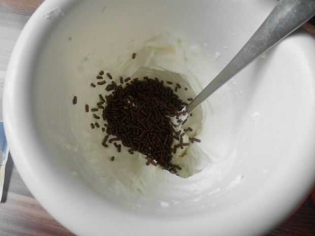 Una vez dura la crema, agregar chispitas de chocolate a la taza.