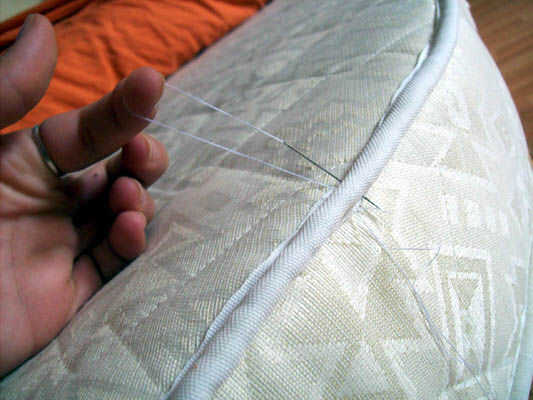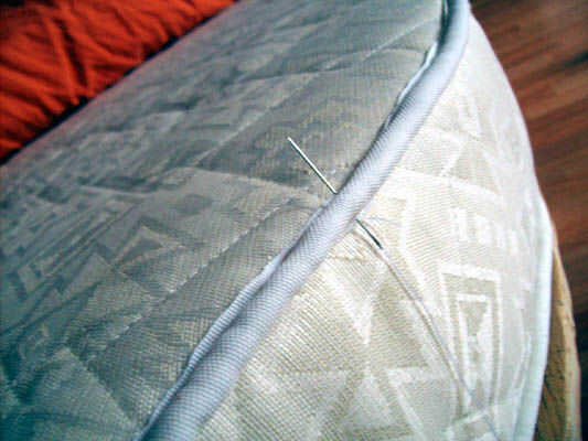 Entonces prepare su entretenimiento opcional y coser la funda en la raya de algodón en los bordes de la parte lateral y la parte central del colchón y coser a través de (los cuadros explican mejor - nota que tomé las fotos de costura terminado el procedimiento de coser, lo siento).