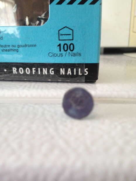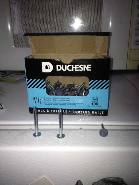 De todas las uñas a elegir recomiendo clavos para techo. Son baratos, brillante, sensible y tienen bien grandes, redondas cabezas que son planas y no molestan a su hombro. Debe hacer una caja de 100 clavos y por 5 dólares se pueden obtener más si necesita.