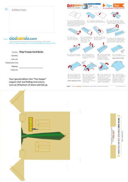 Siempre me impresionó por Firebox.com y la manera en que incluye un paquete de dulces en cada paquete que envían. Cada vez que ordenó y recibió un paquete de ellos, me sentí especial en que había pensado para darme un pequeño regalo, que me hizo sentir amado como cliente. Porque mi producto es muy barato, yo no podía permitirse el lujo de poner dulces en cada paquete, así que pensé que de otra cosa que podría hacer el paquete especial. Tengo que imprimir una factura con cada pack por lo que en vez de hacer esto aburrido imprimí un proyecto especial en cada uno para que si el destinatario abre el sello de la factura sería encontrar un pliegue pequeño encima de la camisa de origami dentro con las instrucciones. La camisa fue diseñada para ser como la camisa de un cuidador de zoológico pero la insignia en el bolsillo dice encargado de Poo.