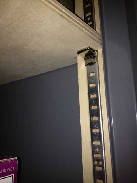 Agregar clips de estantes a varias alturas y luego instale sus estantes. No muy próxima a la parte superior o te encontrarás es demasiado fácil de desalojar ese estante superior. Quedarse uno o dos ranuras debajo de la parte superior parece funcionar bien (o fije el estante superior los clips).