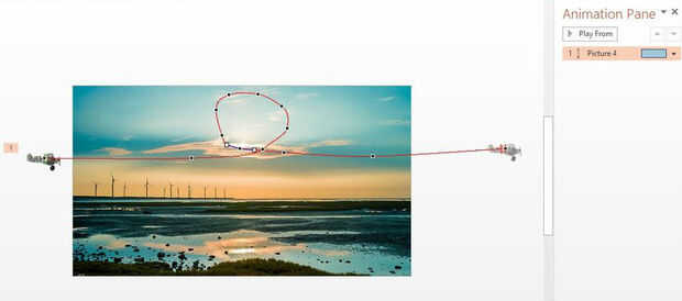 Con el plano seleccionado, tiene que agregar animación y seleccione ruta de costumbre. Dibujar una línea de straight(ish) con un lazo en el centro. No importa si el lazo es un tipo raro de hexágono! Porque ahora, derecha haga clic en la línea y seleccione puntos de edición. Haga clic en todos los puntos y elegir punto liso. Entonces ángulo la alterna azul y blanco para crear un bucle suave.