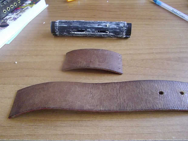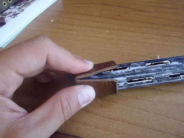 Entonces, averiguar cómo muchas piezas de cuero ajuste en sus manos. Si no encajan perfectamente, hacer una tira más fina para cada agarre pueden cubrir toda la longitud. Envolviendo la cinta alrededor de la empuñadura puede ver dónde cortar y luego con sus tijeras cortarlo suficiente para que los dos extremos casi tocan unos con otros (debe existir una holgura). Cuando tienes listo, abrir unos agujeros con la Dremel. Tratar de hacer los agujeros en cada extremo de la tira de cuero isométrica. Los agujeros deben ser lo mas ajustados posible (quizá tan pequeño como la línea de pesca).