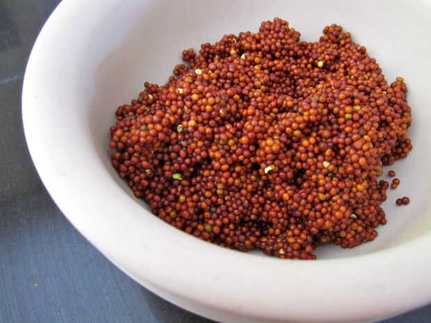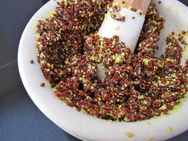 Si no eres un fan de mostaza de grano entero, crush/proceso de las semillas de mostaza finamente y encuentras un tamiz de malla muy fina. Presione la mezcla alrededor del tamiz con una espátula, dejando las cáscaras y tratando las partes internas de las semillas a través de un tazón de fuente.