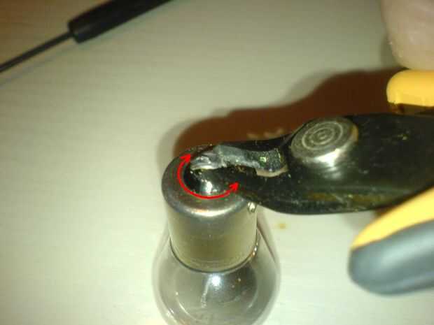 Ahora tenemos que quitar la placa de contacto eléctrica para sacar de la manga del casquillo del metal. Con el asimiento de cortador de alambre la placa de contacto eléctrica y al mismo tiempo de vuelta alrededor de la tapa de la manga. El contacto se levantará y podrás eliminarlo.