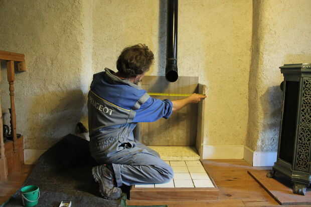 Yo entonces lo colocó en la posición en el hogar y con la madera de la estufa en su lugar, comenzó a construir el encofrado de madera alrededor de ella para guiarme en la construcción de la pared de piedra.