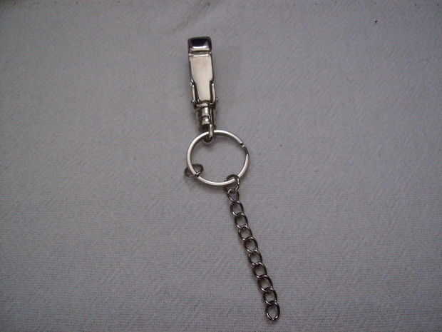 NOTA ESTE PASO: SI EL CARABINERO NO TIENE UNA TERMINACIÓN MÓVIL QUE PERMITE EL LLAVERO "ROTAR" Y SI QUIERES SEGUIR EL MODELO ORIGINAL, LA CADENA CORTA DEBE COLOCARSE EN EL LADO DERECHO.