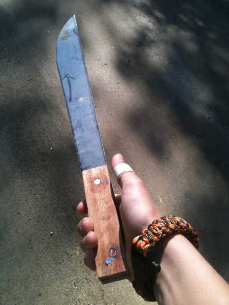Ahora, después de taladrar los dos agujeros, marque la longitud que tendrá que cortar su clavija o varilla y cortar dos de ellos. Así, con todas sus partes, su tiempo de busto el epoxi! Unte a la empuñadura de la hoja con epoxy y sándwich entre los dos trozos de madera, alineados con los agujeros perforados y poner un poco de epoxy en las dos clavijas/barras corte y libra en. Finalmente, sujete el mango en una prensa y dejar durante la noche!