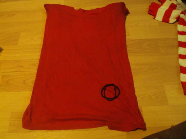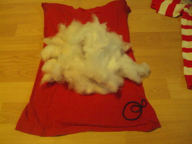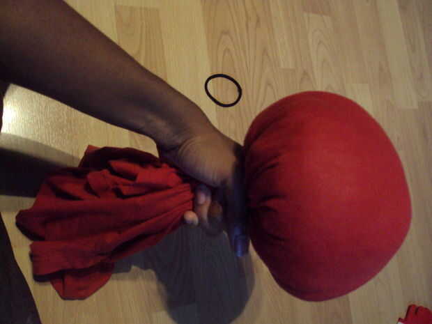 Pone tu camiseta y con Poly-Fil, rellenar el interior de la camiseta hasta lograr un tamaño deseable para la cabeza. Con el montón de Poly-Fil dentro de la mitad de la camisa, agarrar ambos extremos de la camisa, juntar y gírela. Usted querrá asegurarse de que crea una forma esférica en el montículo. Sujetelo bien con una banda de caucho entre el montículo y la camiseta.